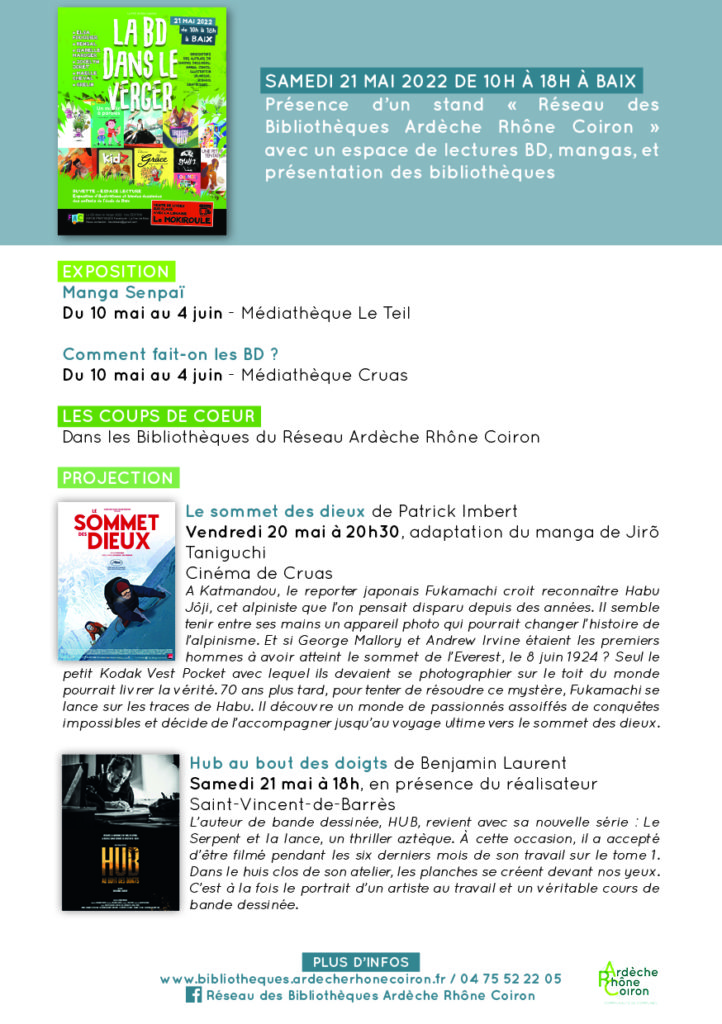 - Baix – Pendant le Festival, samedi 21 mai 2022 de 10h à 12h et et 14h à 16h : Présence d’un stand « Réseau des Bibliothèques ARC » avec un espace de lectures BD, mangas et présentation des Bibliothèques.