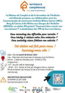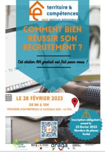 – 8h30 – 10 h : atelier animé par Margaux Henry, experte RH de la Maison de l’emploi et de la formation Ardèche méridionale