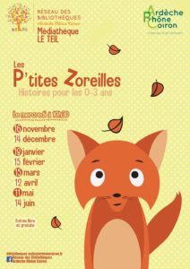 Le Réseau des Bibliothèques Ardèche Rhône Coiron, vous invite à un cycle d’animations « Les p’tites Zoreilles » autour de lectures d’albums pour les tout-petits dans les bibliothèques d’Alba la romaine, Saint Thomé, Valvignères et à la médiathèque du Teil. Ces lectures s’adressent aux enfants de 0-3 ans, accompagnés de leurs parents.