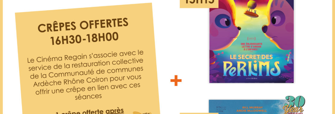 Le Cinéma Regain s’associe avec le service de la restauration collective de la Communauté de communes Ardèche Rhône Coiron pour vous offrir une crêpe en lien avec ces