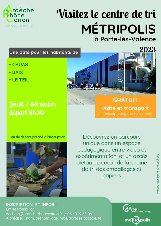 La Communauté de communes Ardèche Rhône Coiron organise en partenariat avec le SYPP des visites gratuites (transport et visites guidées) du centre de tri MeTRIpolis à Porte-Lès-Valence.