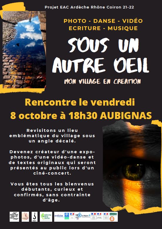 aubignas , FranceLa rencontre sous un autre œil, un projet de l’Éducation Artistique et Culturel d'Ardèche Rhône Coiron Vendredi 8 octobre à Aubignas - 18h30 Revisitons un lieu emblématique du village sous un angle décalé. Devenez créateur d'une expo-photos, d'une vidéo-danse et de textes originaux qui seront présentés au public lors d'un ciné-concert. Vous êtes tous les