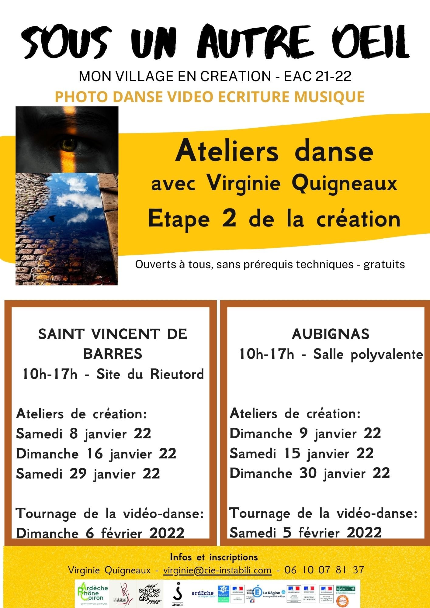 aubignas , FranceCes ateliers s'inscrivent dans le programme d’Éducation Artistique et Culturelle de la CC Ardèche Rhône Coiron. Le projet "Sous un autre oeil" à commencé avec les ateliers photos avec Charles de Borgraeff (cf dates précédent post) et Présence(s) Photographie. Voici maintenant les dates des ateliers de danse et du tournage de la vidéo-danse. * Équipe