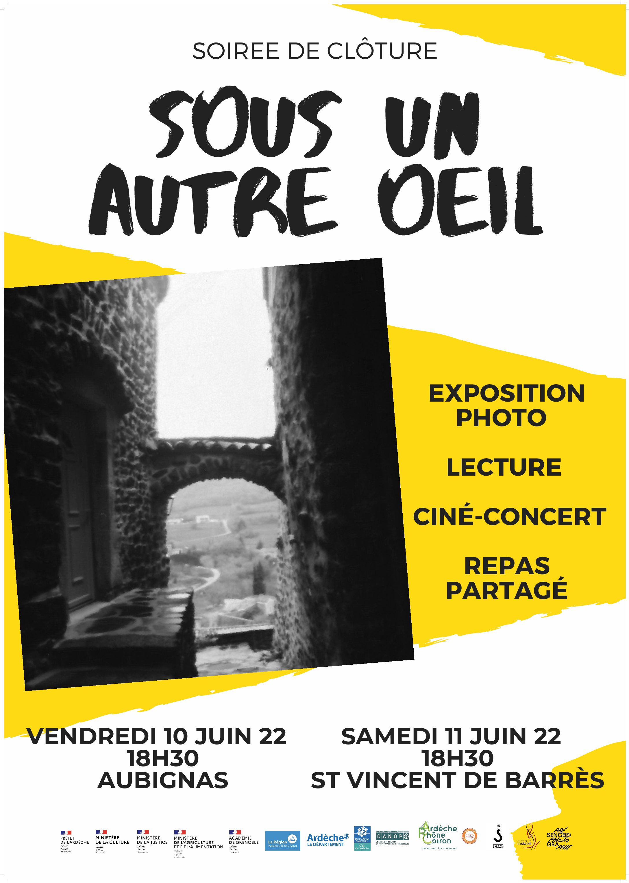 aubignas , FranceEXPOSITION PHOTO LECTURE CINÉ-CONCERT REPAS PARTAGÉ 18h30 ACCUEIL - Verre de l'amitié 19h00 - DÉAMBULATION Exposition photo et lectures 20h00 CINÉ-CONCERT Concert de musique live sur chacune des deux vidéos-danse du projet 21h00 REPAS PARTAGÉ Consulter le programme : ICI L'équipe du projet Sous un autre OEil Les habitants-participants de Aubignas et de Saint Vincent