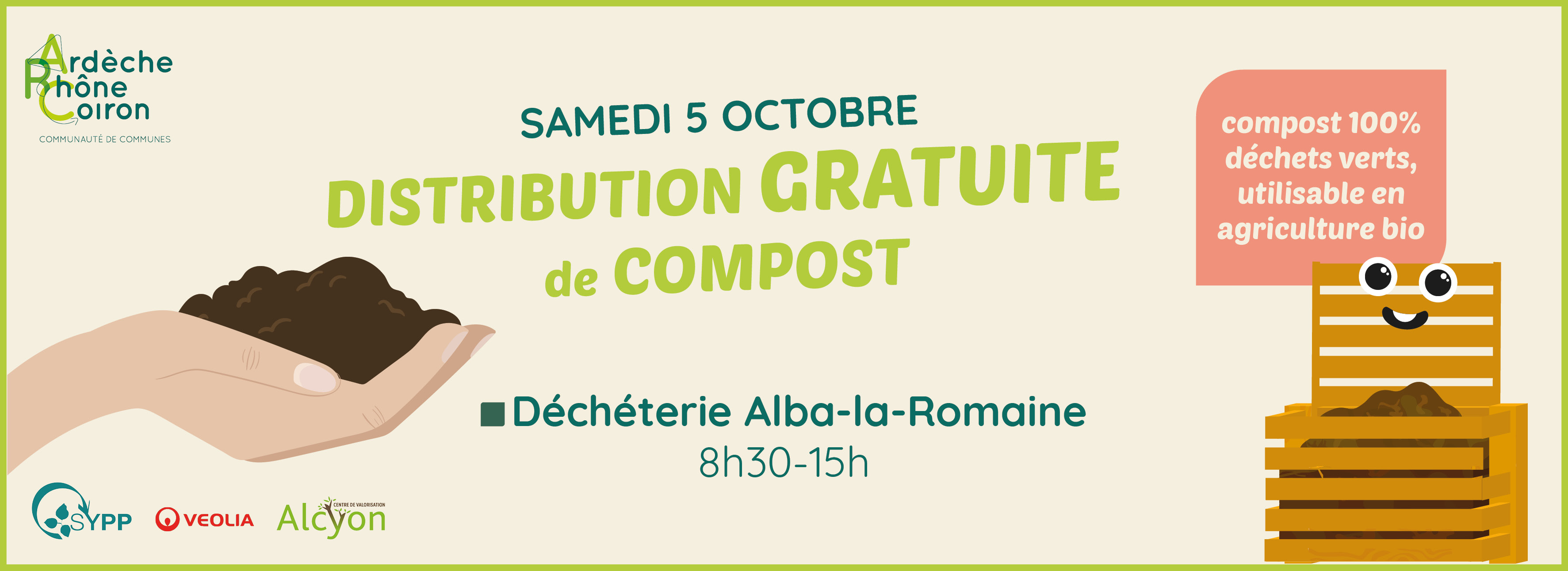 decheterie, alba-la-romaine 1363 Route de Valvignères, Alba-la-Romaine, France◾ SAMEDI 5 OCTOBRE à la déchèterie à Alba-la-Romaine 8h30 - 15h ▶️ 500l max. par personne ? Prévoir un contenant et une pelle ?? 100% déchets verts - convient à l'agriculture bio Gratuit