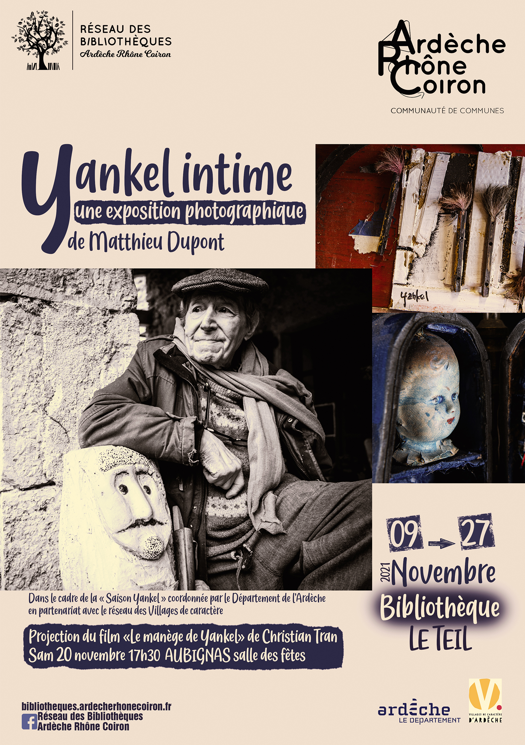 Le Teil et Aubignas , FranceUne exposition photographique de Matthieu Dupont à la médiathèque au Teil. Et projection de film "Le manège de Yankel" de Christian Tran - le 20 novembre 17h30 à la salle des fêtes d'Aubignas.