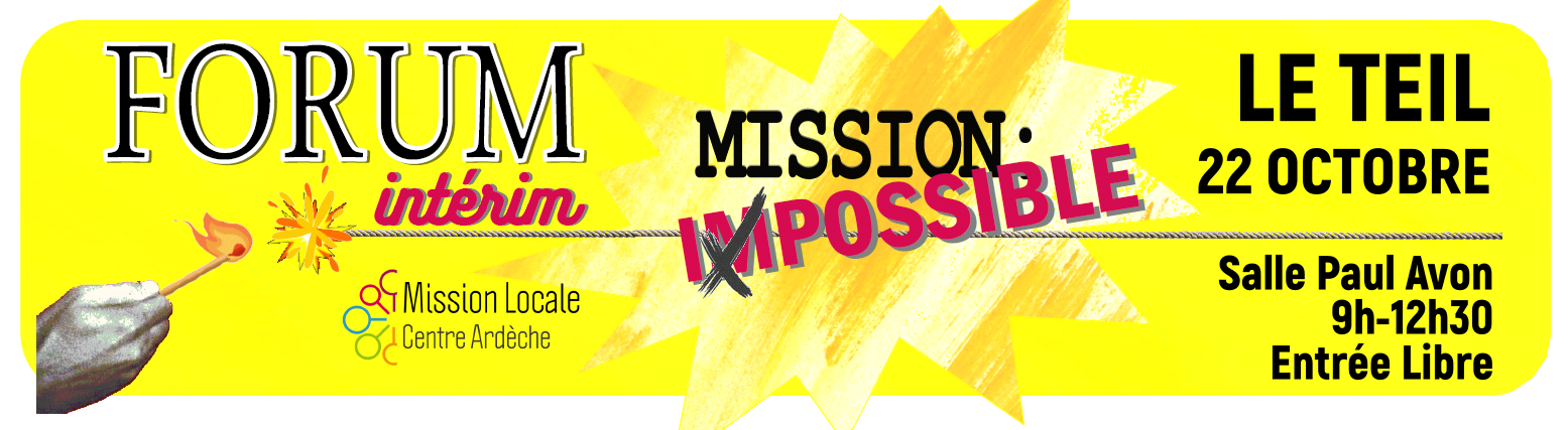 Le TeilDans le cadre des conventions « Mission Jeunes » entre la Mission Locale Centre Ardèche et les entreprises de la branche de l’intérim, nous organisons un Forum Intérim le 22 Octobre de 9h à 12h30 à la Salle Paul Avon à Le Teil. 21 agences intérim ayant signé ces conventions seront présentes avec de nombreuses offres d’emploi.