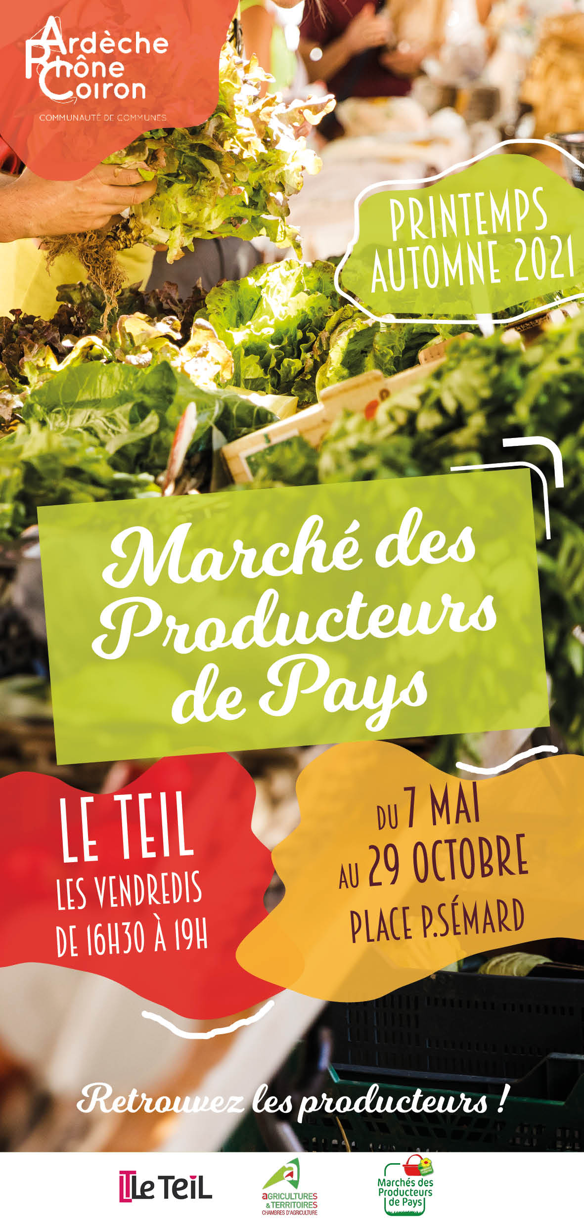Le TeilLe Marché des Producteurs de Pays aura lieu du vendredi 7 mai au 29 octobre 2021- Place Pierre Sémard au Teil de 16h30 à 19h Un rendez-vous hebdomadaire les vendredis après-midi avec des producteurs locaux qui garantissent : la qualité fermière des productions, des produits locaux, de saison et des spécialités de pays la qualité