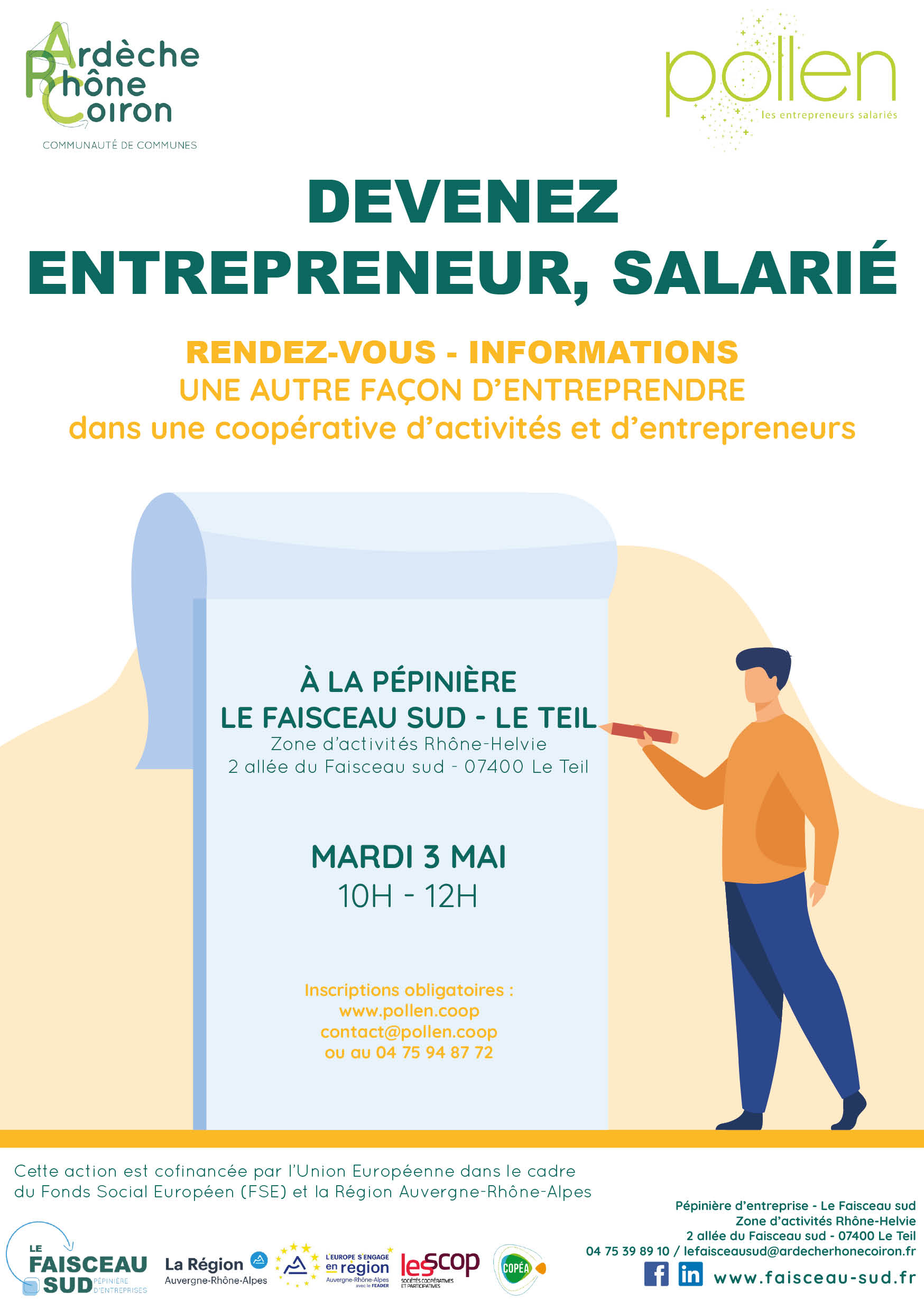 Le TeilPOLLEN SCOP propose des réunions d’informations pour devenir entrepreneur.es salarié.es dans une coopérative d’activités et d’emploi. Mardi 3 Mai 2022 de 10h à 12h Pépinière d'entreprise le Faisceau Sud - LE TEIL Renseignements au 04 75 94 87 72 Sur inscription uniquement : https://pollen.coop/contact