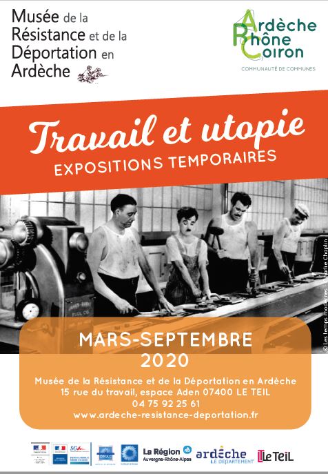 Musée, Le Teil 15 rue du Travail - Espace Aden, Le Teil, FranceAu musée de la Résistance et de la Déportation en Ardèche de mars à septembre 2020. Exposition temporaire prolongée du 24 février au 30 mars : 1940 combats et résistances. Cycle travail et utopie du 14 avril au 31 mai : 1943, l'année des tournants. Du 5 juin au 5 septembre : CNR, la République