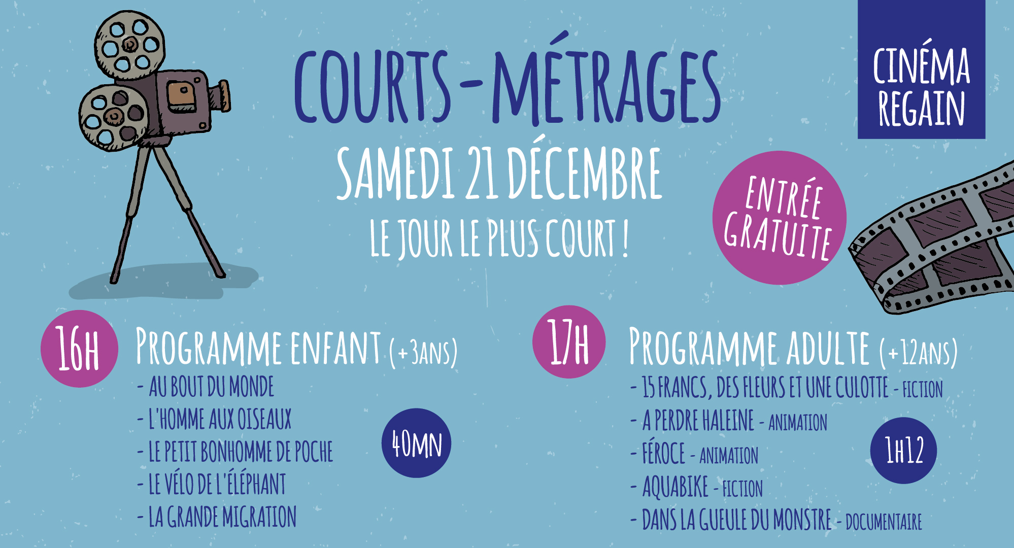 Cinéma Regain 3 montée du chateau, LE TEIL, FrancePour le jour le plus court de l'année nous vous proposons une journée COURTS-METRAGES ! SAMEDI 21 DÉCEMBRE au cinéma Regain : 16h00 PROGRAMME ENFANT (40mn) - Au Bout du monde - L'homme aux oiseaux - Le Petit Bonhomme de Poche - Le Vélo de l'éléphant - La Grande Migration 17h00 PROGRAMME 12 ANS ET